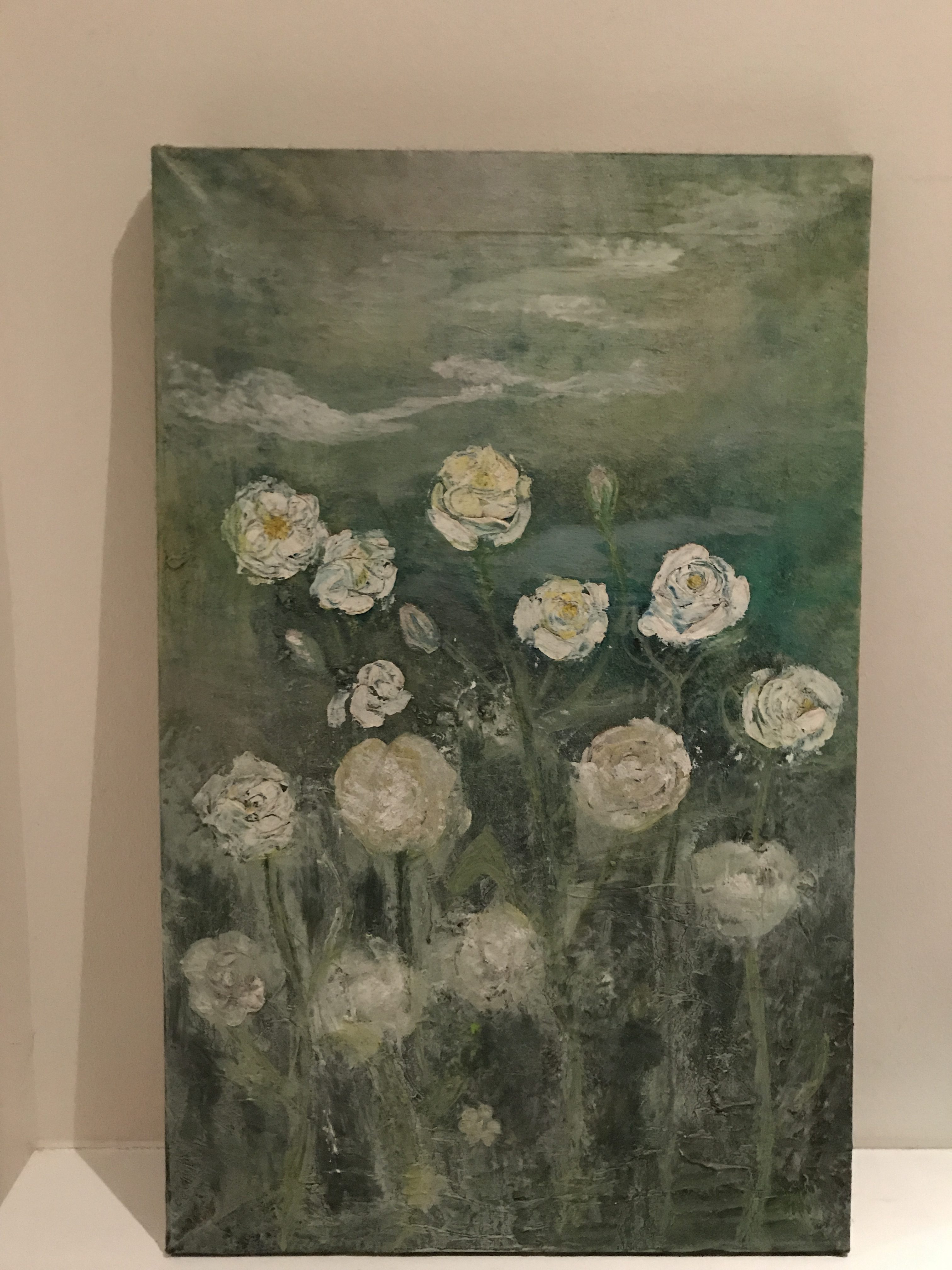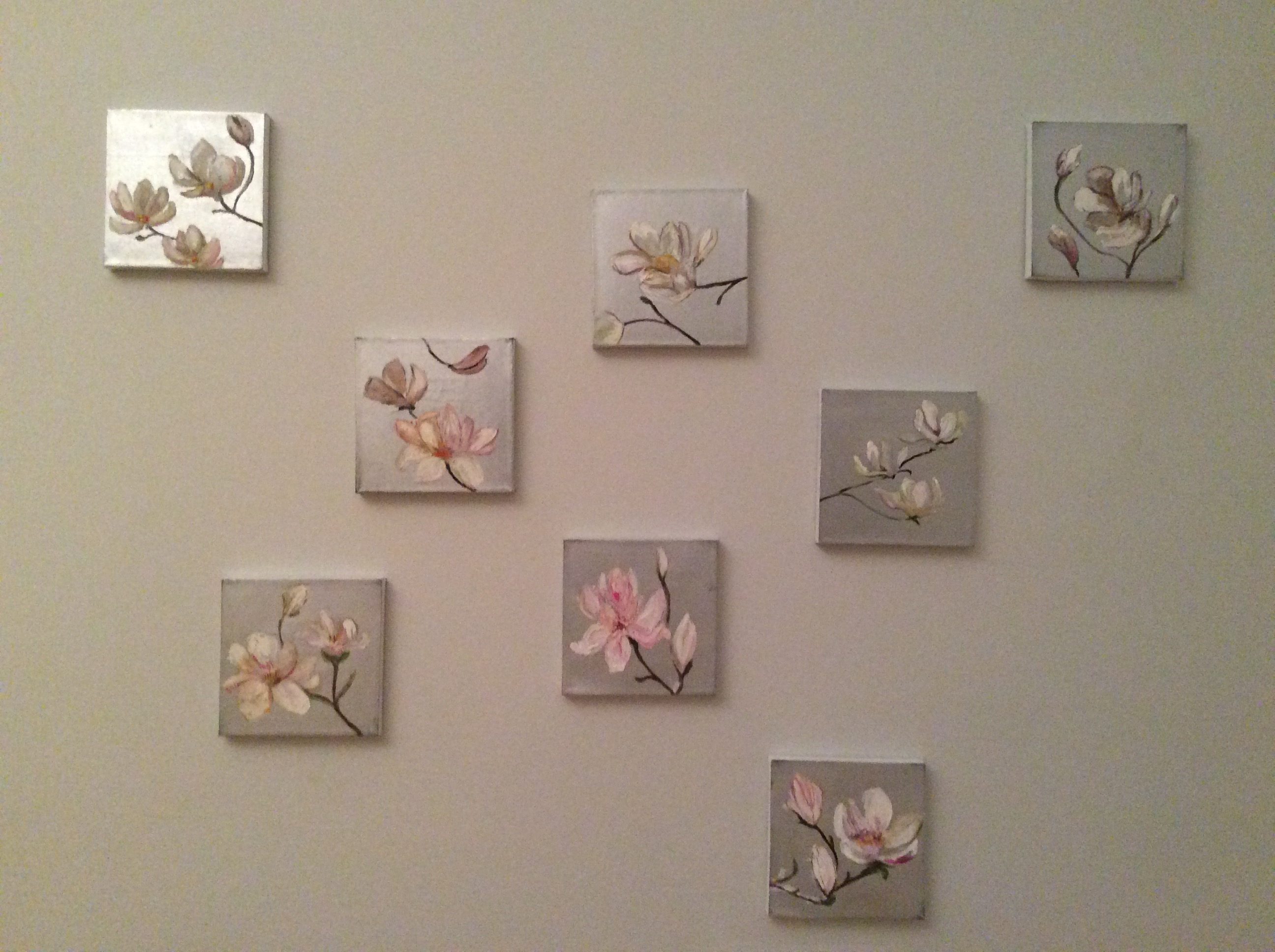 Magnolia blomster. Olie og sølvlak på lærred. 10×10 cm. (2018)