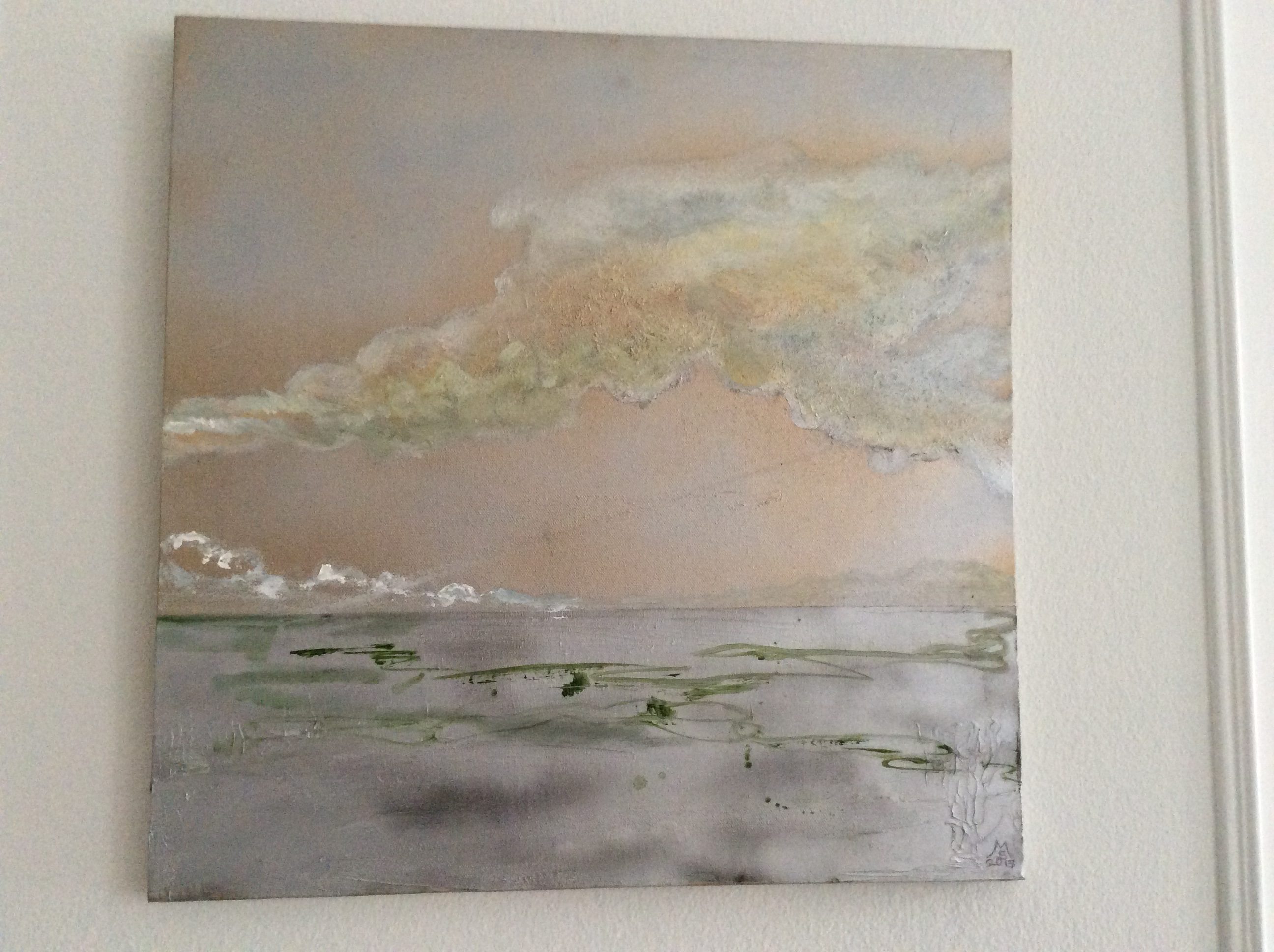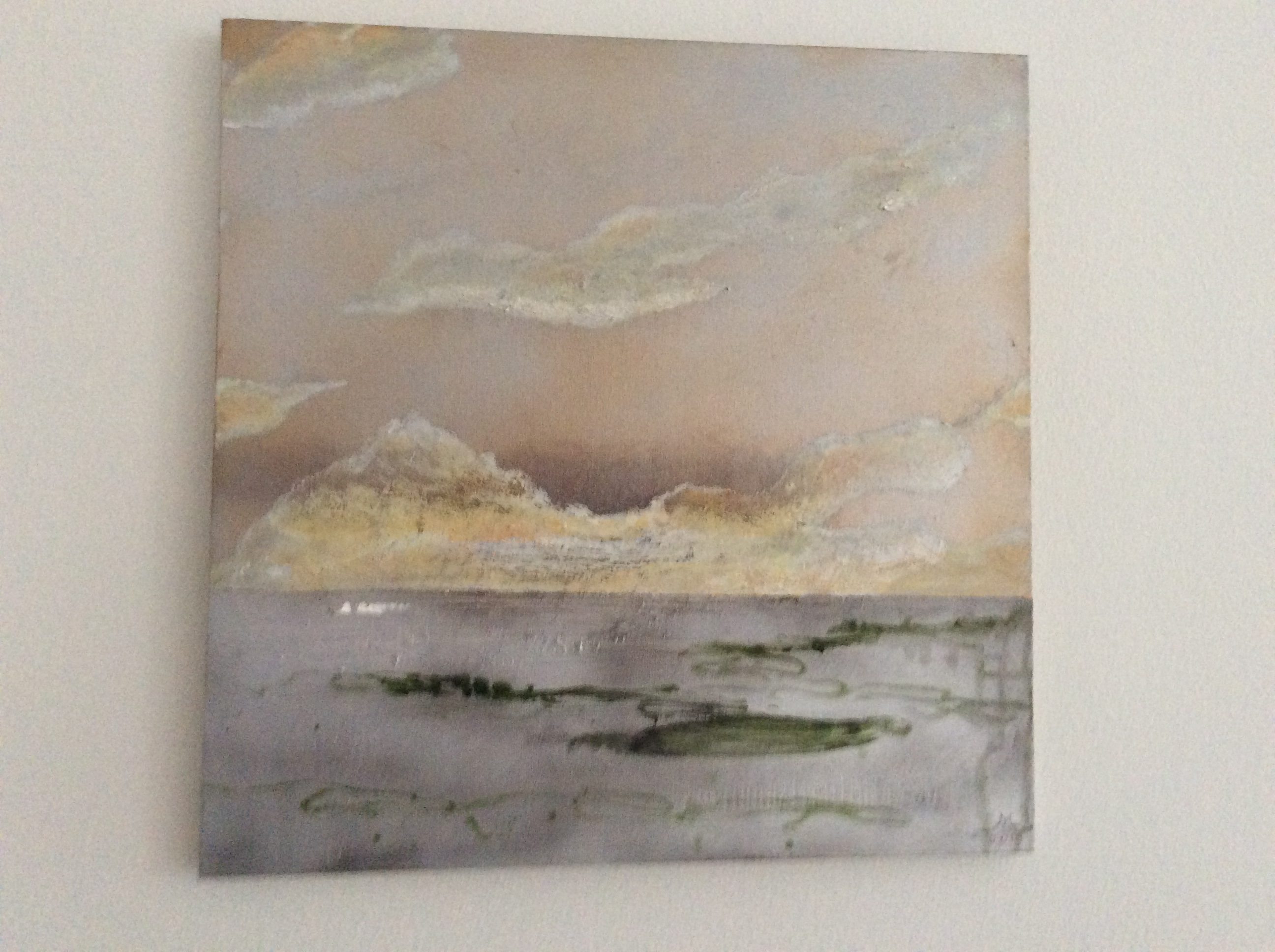 Morgenlys fra Dannerhøj II. Olie, sølv- og guldlak på lærred. 50×50 cm (2019)